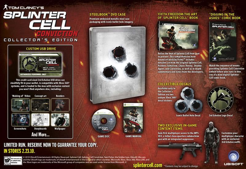 Se acaba de revelar que tendra y como vendrá la edición de colección de Splinter Cell Conviction aunque faltaron los obligados goggles de visión nocturna en esta edición, pero naah! Ya no importan mucho, la verdad ya chole con las ediciones especiales que luego ni lo son, pero este paquete incluirá una serie de cosillas interesantes por 80 dólares, cuando salga el 23 de febrero.