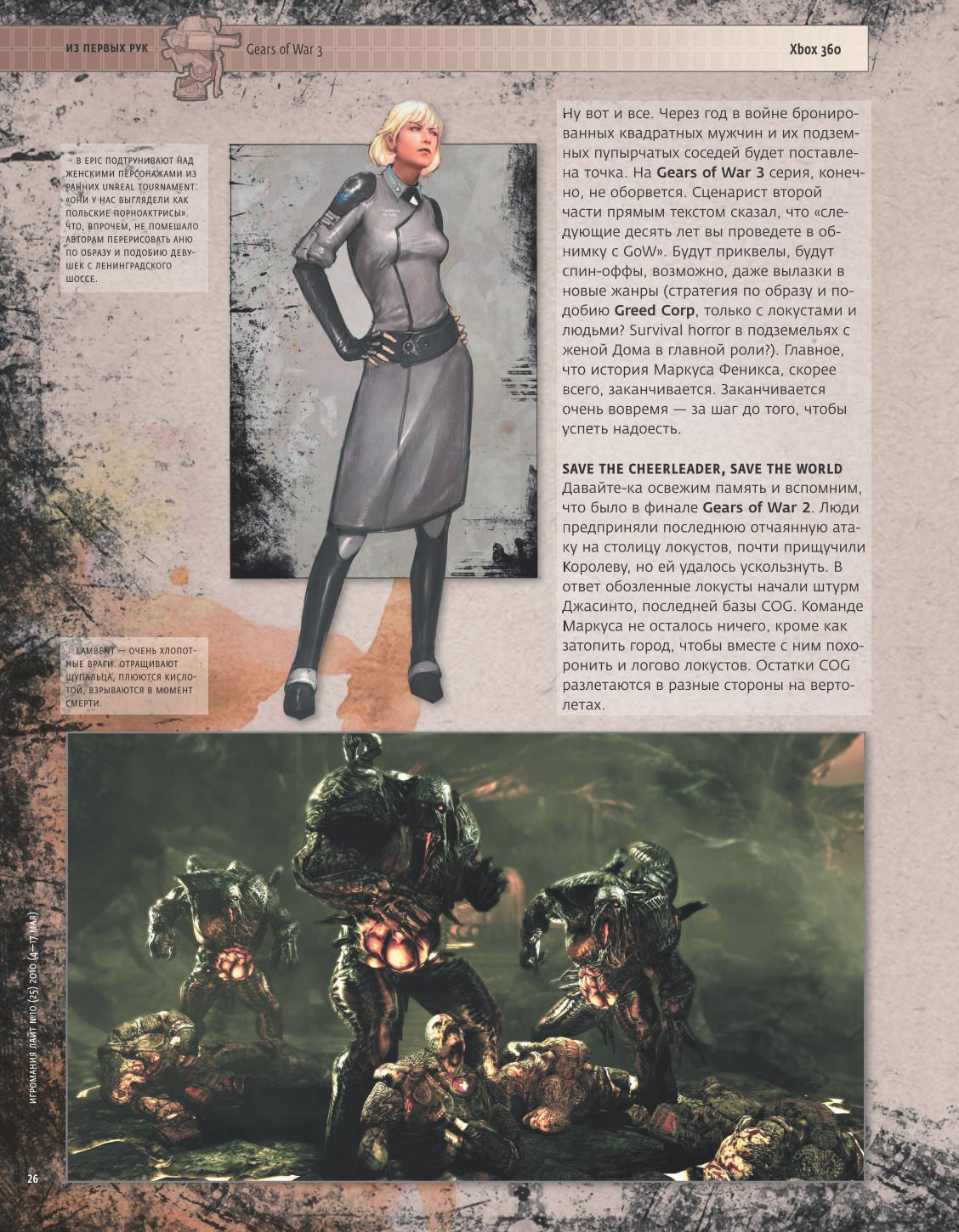 El dia de hoy se ha dado a conocer informacion acerca del tan esperado Gears of War 3, la informacion ha sido revelada para sorpresa de muchos a travez de una publicacion Rusa, como era de esperarse los propios fans de la serie se han dado a la tarea de traducir dicha informacion para deleite de los demas gamers.
