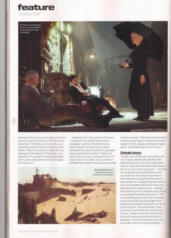 La revista PS3M en su numero 57 ha revelado información y detalles de Uncharted 3: Drake’s Deception, les traemos algunos de ellos así como también los scans de esta revista. Después del salto pueden ver todo esto.