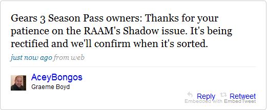 Algunos compradores de Season Pass de Gears Of War 3 han tenido problemas al descargar este DLC gratuito RAAM’s Shadow.