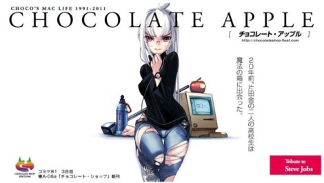El manga “Chocolate Apple 1991-2011“, publicado en la pasada Comiket 81. En este manga la historia se centra en el descubrimiento del autor por las computadoras Apple y el escencia Adobe Photoshop mientras se encontraba en la escuela media. En el se puede ver a un Steve Jobs transformado en una atractiva chica tipo manga, más con la vestimenta y poses caracteristicas del padre del iPod.