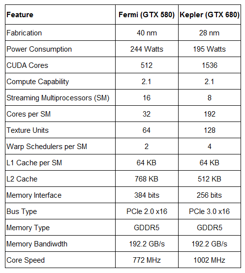 Eso era el pasado ahora la compañía presenta la arquitectura Kepler, en la nueva GTX 680 ahora cada SM es llamado SMX y contienen 192 núcleos CUDA para un total de 1536 núcleos en total en cada GPU, que da como resultado mucho mayor rendimiento en el procesamiento, junto a esto los motores de polimorfo se han rediseñado para que rindan el doble, lo que los ingenieros llaman comúnmente «una mejora significativa en cargas de teselación». Otra cosa que hay que tener en cuenta es que todos los núcleos CUDA de esta arquitectura trabajan a una velocidad de reloj mucho más baja lo que da como resultado que el consumo de energía sea mucho menor que su antecesora. También hay que hablar de la memoria Cache quien es la que amortigua el procesamiento cuando hay una sobrecarga de trabajo, en esta arquitectura se tienen 4 controladores de memoria de 64bits y funcionan a una velocidad de 6008MHz, en la anterior arquitectura se tenían 6 pero su velocidad era de 3696MHz.