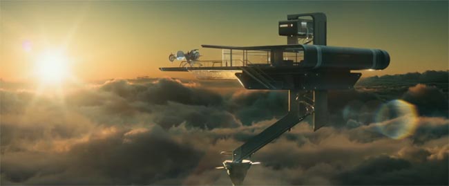 Con solo dos películas en su haber, Kosinski se estableció como uno de los visionarios estéticos líderes de nuestra generación, un creador de mundos ricos con un diseño notable y una belleza maravillosa que también se combina con acción propulsiva, ideas ingeniosas y temas poderosos en un diseño cohesivo. Esto nunca ha sido más cierto que en Skytower. A fines del siglo XXI, el mundo por encima de las nubes presenta un duro contraste con el dilapidado estado de la Tierra. A medida que los operativos del equipo de limpieza de Jack y Vika se preparan para los días finales antes de unirse a los sobrevivientes restantes en una nueva colonia, viven en una comodidad funcional y disfrutan de una vista sorprendente. Gilford explica la inspiración para este universo: “El contraste entre esos dos mundos—por encima de las nubes y en la Tierra—fue importante desde el punto de vista del diseño. Tuvimos que establecer este mundo arriba, que es un entorno sintético, limpio y con alta tecnología. Debajo están las ruinas de la Tierra y la plaga de carroñeros. La intersección de esos dos mundos y cómo chocan son importantes.