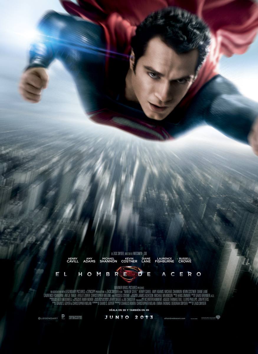 Elenco: Henry Cavill, Amy Adams, Michael Shannon, Kevin Costner, Diane Lane, Laurence Fishburne, Antje Traue, Ayelet Zurer, Christopher Meloni y Russell Crowe.