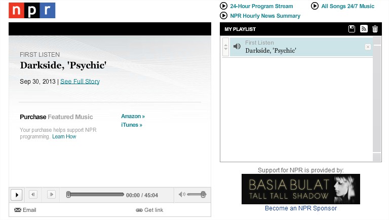 Darkside – NPR Media Player Publicado 1 octubre, 2013 en 768 × 434 en Darkside | Escuchen su nuevo álbum completo «Psychic» ← Anterior