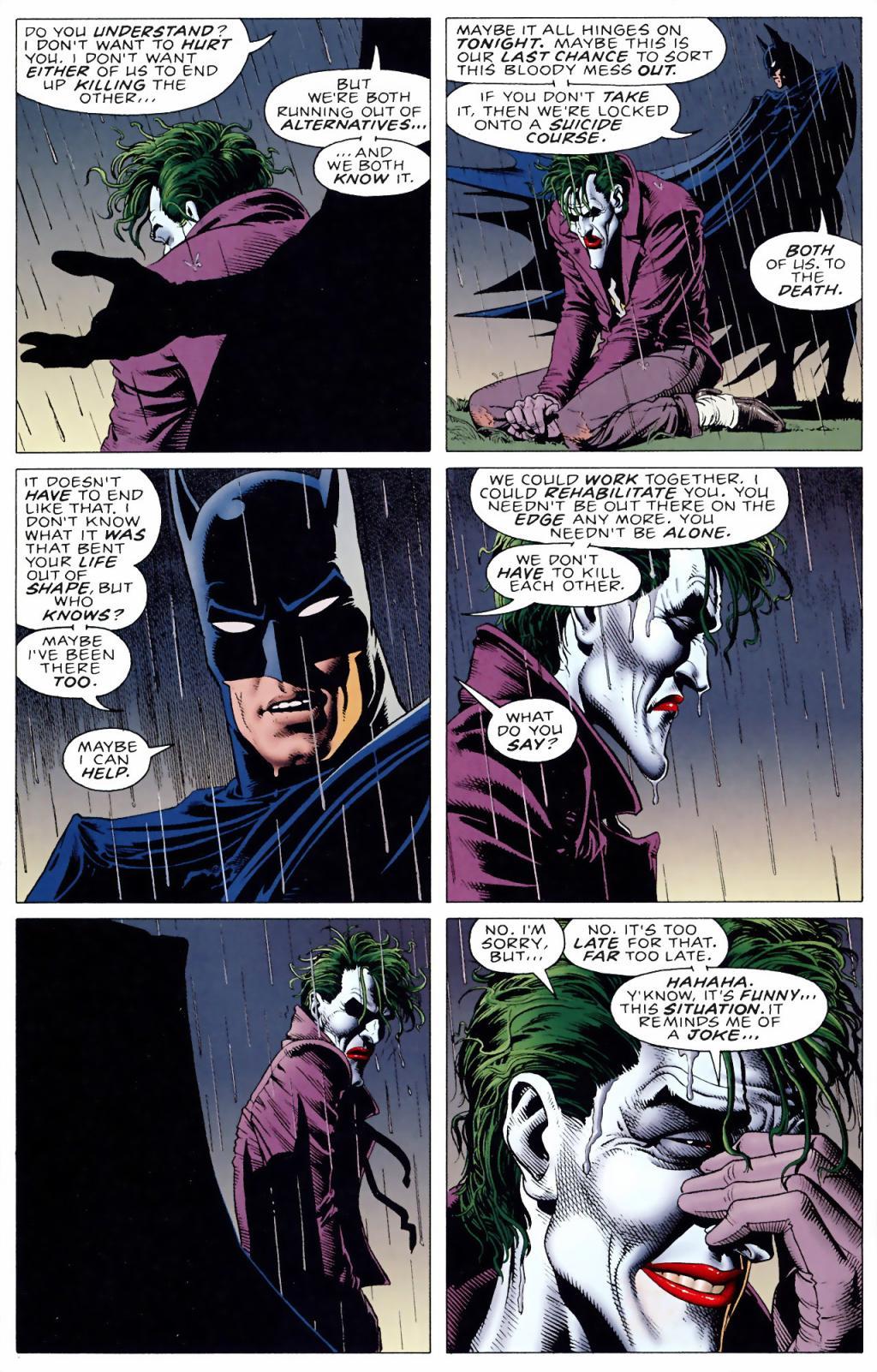 1.- La relación extraña que existe entre Joker y Batman analizando la psicología de cada uno y remarcando que en ambos hay una locura, por alguna extraña razón ninguno de los dos quiere asesinar al otro y el único final para ellos es la muerte..