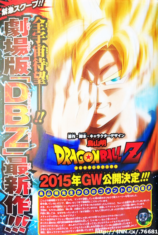 El próximo sábado anunciaran que una nueva película de DBZ será estrenada el próximo año durante el periodo conocido como la “Semana Dorada”. Lo importante de esto es que Akira Toriyama será quien cree el concepto original de este filme, además de hacer el guión y los diseños de nuevos personajes. La idea según Toriyama es crear una nueva aventura, tal como se hizo en Battle of Gods pero que esa fue escrita por Yusuke Watanabe.