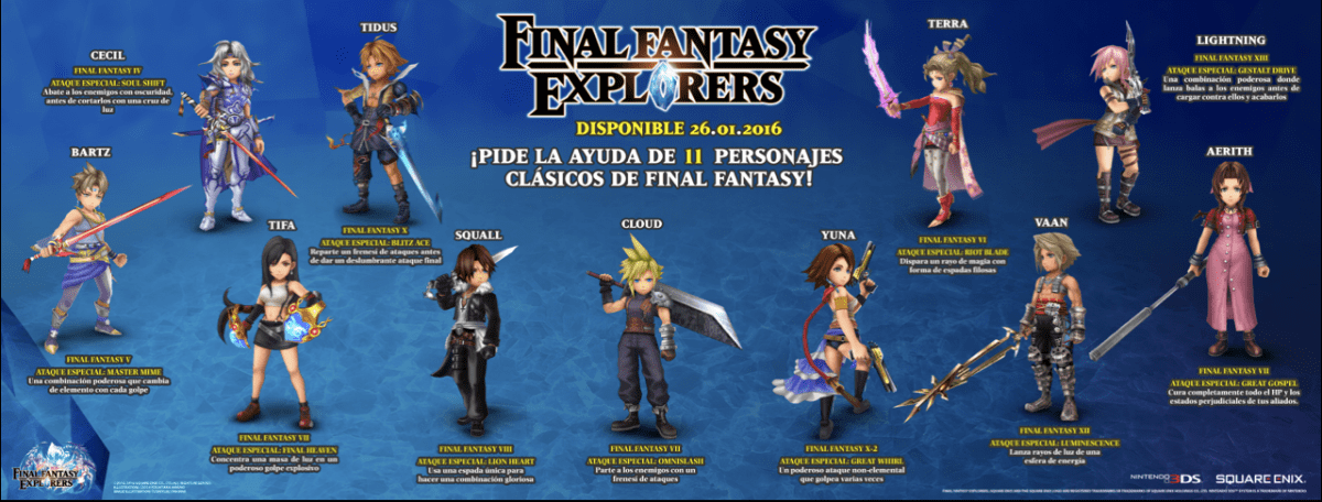 Final Fantasy Explorers Characters Publicado 21 enero, 2016 en 1280 × 487 en Final Fantasy Explorers | Juega este martes como uno de los legendarios personajes de la saga. ← Anterior