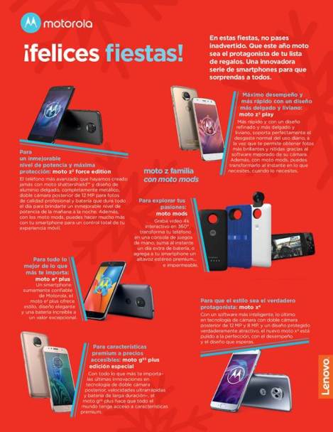 Algunos de estos productos son por ejemplo el Moto Z2 Force, que lo encuentras en dos versiones especiales: con el Moto Mod Insta-Share Projector junto con el Moto Power Pack a $19,999.00 y con con elMoto Mod Soundboost 2 más el Moto Power Pack a $16,999.00. Algunos otros son:
