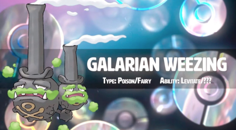 El Weezing de Galar absorbe aire contaminado y gases tóxicos como alimento. Tras procesarlos, expulsa aire purificado por la parte superior de sus cabezas. Las toxinas acumuladas en el interior de su cuerpo se condensan en nubes de gas venenoso que escapan al exterior y se quedan flotando a su alrededor. Este gas es tan nocivo que, solo con olerlo ligeramente, sus oponentes quedan aturdidos e inmovilizados, lo que lo convierte en su mejor arma durante los combates.