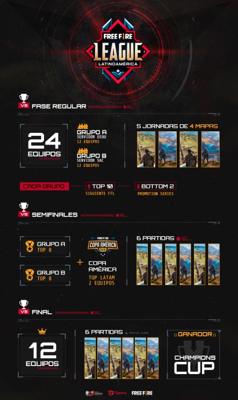 La Free Fire League iniciará el próximo sábado 8 de febrero y este año constará de una sola liga a nivel Latinoamérica dividida en 2 grupos (A y B) que se enfrentarán en 2 fases: Fase Regular y Finales.