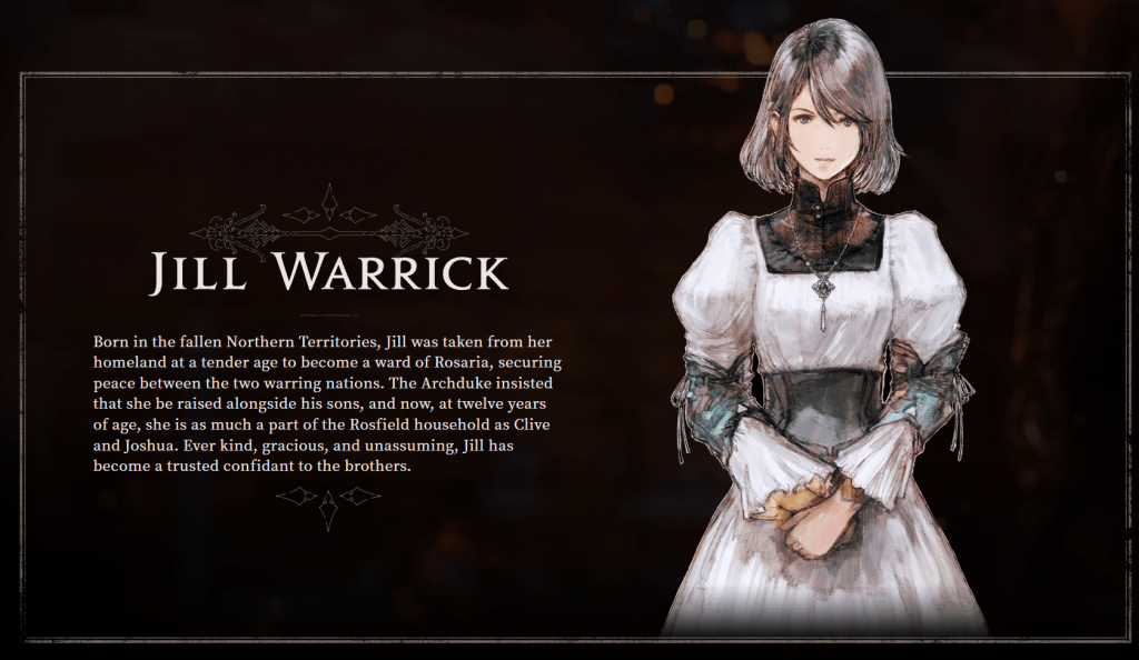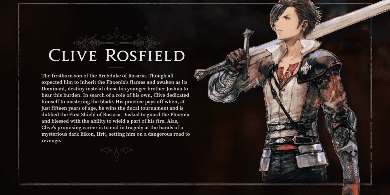 Clive Rosfield será el principal protagonista del título con el objetivo de proteger a su pequeño hermano, Joshua Rosfield, quien cuenta con el poder de Phoenix – Eikon of Fire, siendo lo mismo a los summons clásicos de la serie, pero en FFXVI son conocidos como «Eikons«. Por otra parte, tenemos a Jill Warrick, quien fue tomada de su tierra natal en los Territorios del Norte, una nación que juró lealtad al Grand Duchy of Rosaria para asegurar la paz entre ambos reinos.