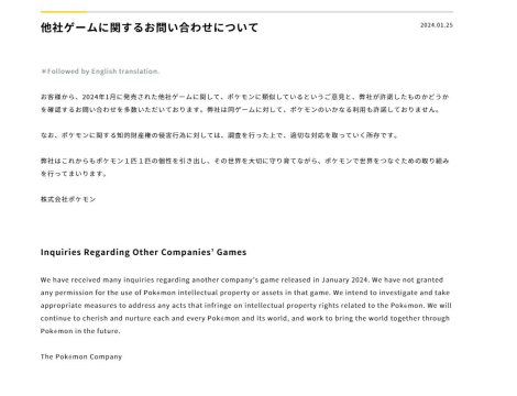 “Hemos recibido muchas consultas sobre el juego de otra compañía lanzado en enero de 2024. No hemos otorgado ningún permiso para el uso de propiedad intelectual o activos de Pokémon en ese juego. Tenemos la intención de investigar y tomar las medidas apropiadas para abordar cualquier acto que infrinja los derechos de propiedad intelectual relacionados con Pokémon”.