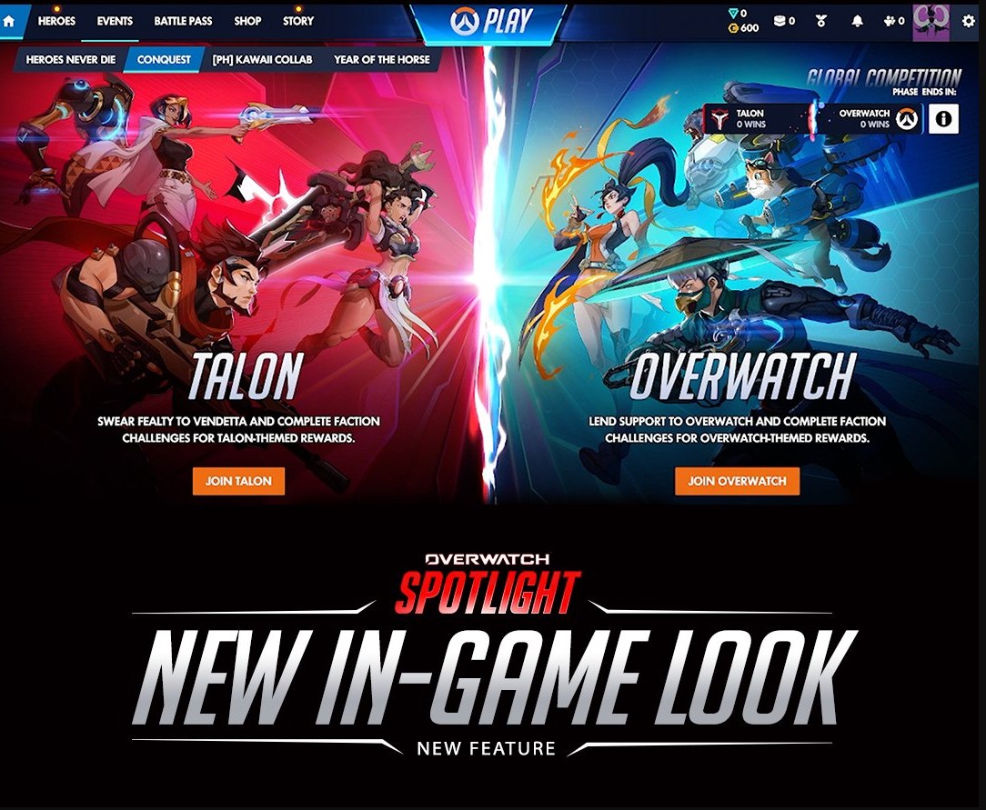 ¡Una guerra de facciones como nunca antes vista! Jura lealtad a Overwatch o Talon a lo largo de cinco semanas para luchar por recompensas, entre ellas 66 cajas de botín, diseños legendarios de Echo, títulos con temática de cada facción y más.